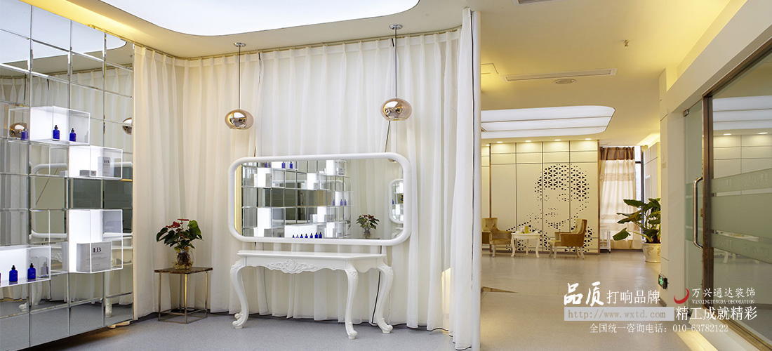 北京装潢公司案例:外观看来宛如长形玻璃盒子的场域,里头正施展着跨越时光的魔法,人们的时间像是被冻结,悄悄地归零后再重新启动,揭开个人熠熠的亮丽光采!接下空间规划任务的构设计,运用拟人般分割、变形及再造的手法,带入现代女性既刚强又柔软的兼容轮廓,让专属女性的医疗美容空间,不再那么冰冷有距离,反而如同一处偷闲的疗愈境域般的存在。