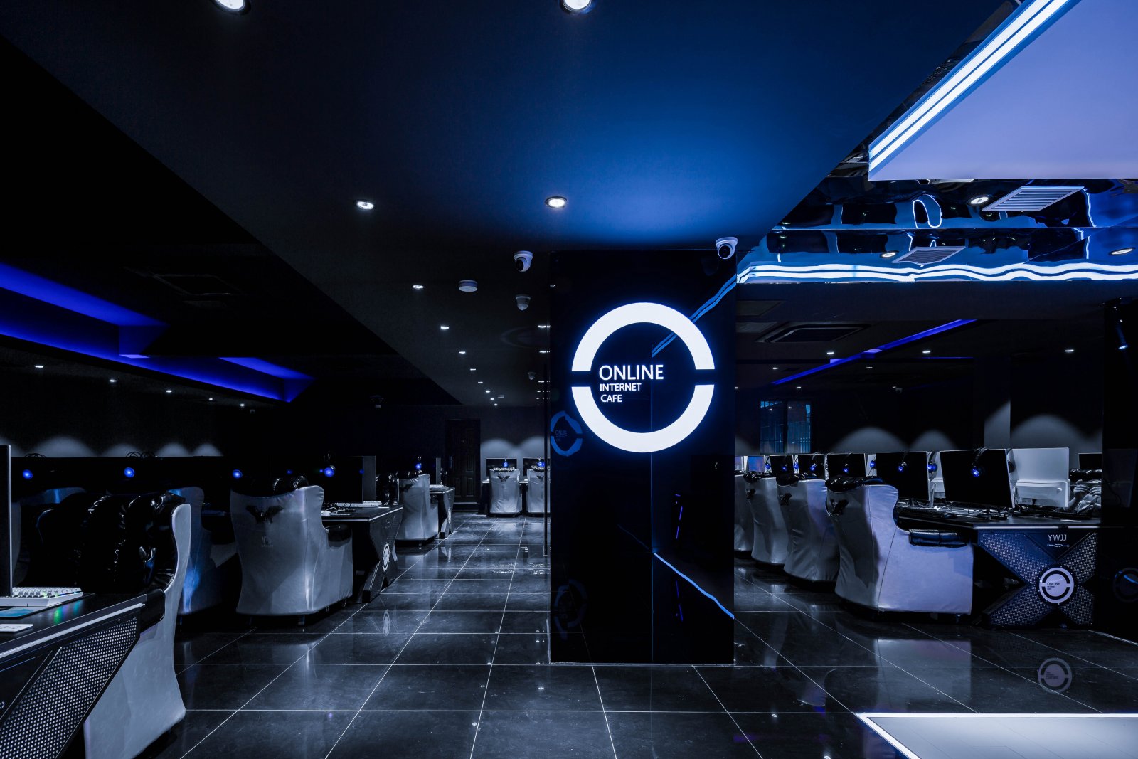 网吧装修案例:电竞灯光网咖,设计装修效果图整体设计风格以酷炫的灯光为基础,在此空间中,明与暗,线与面,光与影,延伸与抵抗,全部以二元对立的方式吸收空间的叙事性,让身体里的每一个细胞在其中激荡。