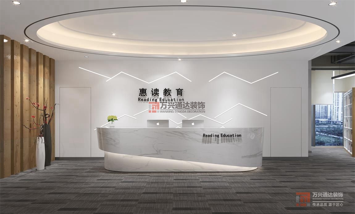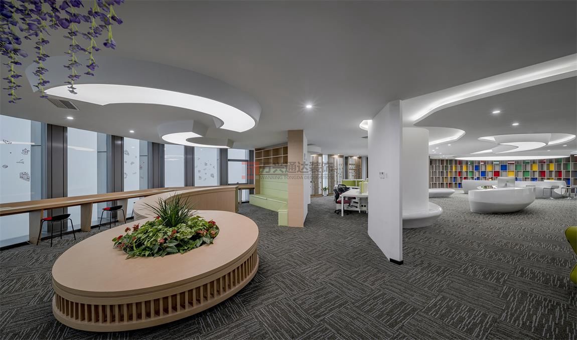 办公室装修公司案例:整体办公空间设计中,大气与细致并存,将设计与艺术结合。设计理念: 室内设计元素均交织凝聚于行云流水的曲线流动空间,设计表现形式不受拘束,每个空间都有自己特殊的弧度,致力于搭建“创新+智能+生态”的办公环境。